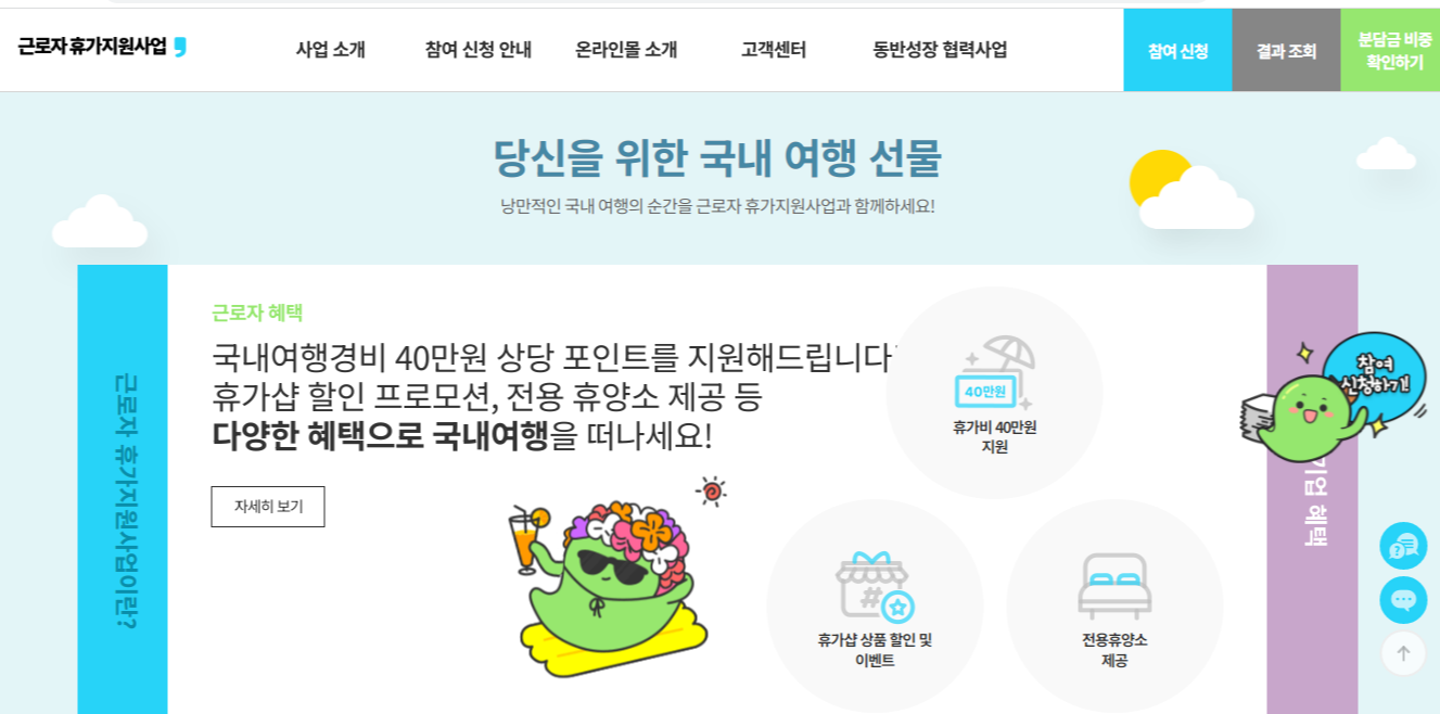 청년들의 여행을 지원하는 근로자 휴가 지원 사업은 정부와 기업이 국내 여행 경비를 지원하는 사업으로, 휴가샵 온라인몰에서 40만 원 상당의 적립 포인트를 자유롭게 사용할 수 있습니다.