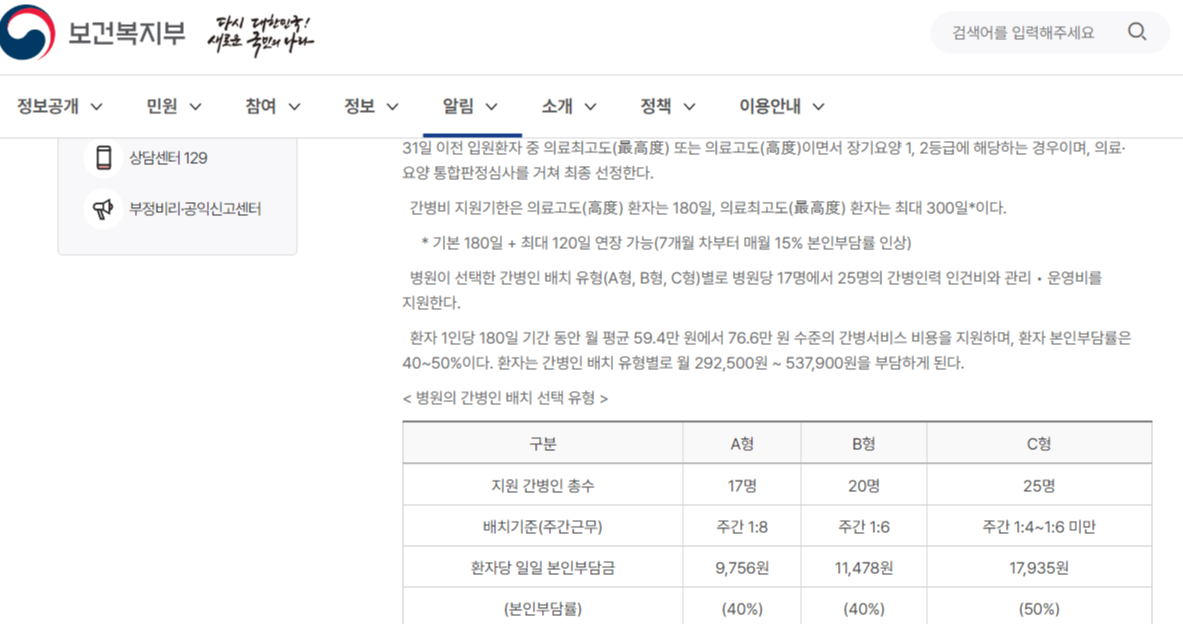 - 저소득층 환자는 병원 연계 간병서비스 무료 이용 가능