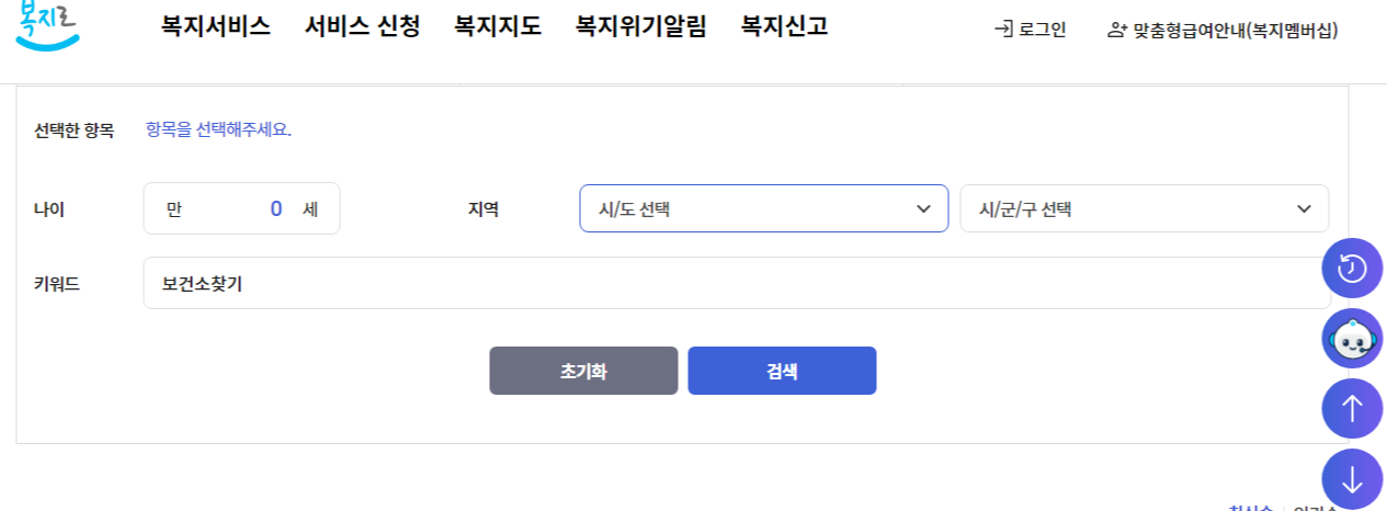 - 복지로 사이트 > 지역 보건소 검색 메뉴 사용