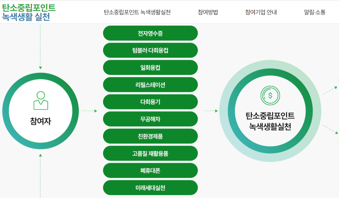 → 일상 속 탄소 감축 활동(전자영수증, 다회용 컵 사용 등)을 하면 정부가 포인트를 지급하는 인센티브 제도입니다.